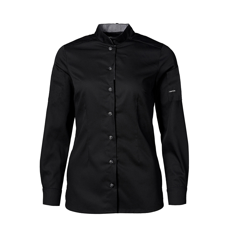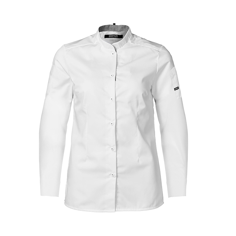 Modern optimal fit, contrast color in the collar, buttons sewn with contrast thread, loop for the apron neck strap, two-part pen pocket on the left sleeve and side slits. 65%PES 35%CO.
