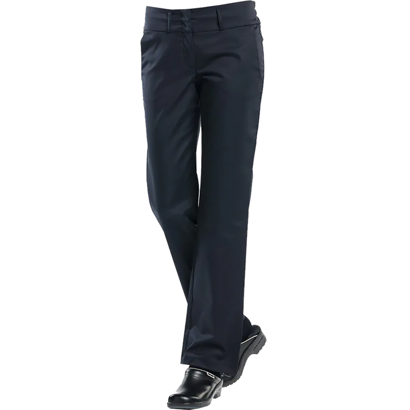Straight-leg cut, zipper closure, elastic insert in back, belt loops. 48%CO 48%PS 4%EA.