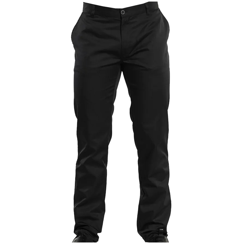 Straight-leg cut, zipper closure, side pockets, one attached pocket in back, elastic insert in back, belt loops. 67%PES 33%CO.