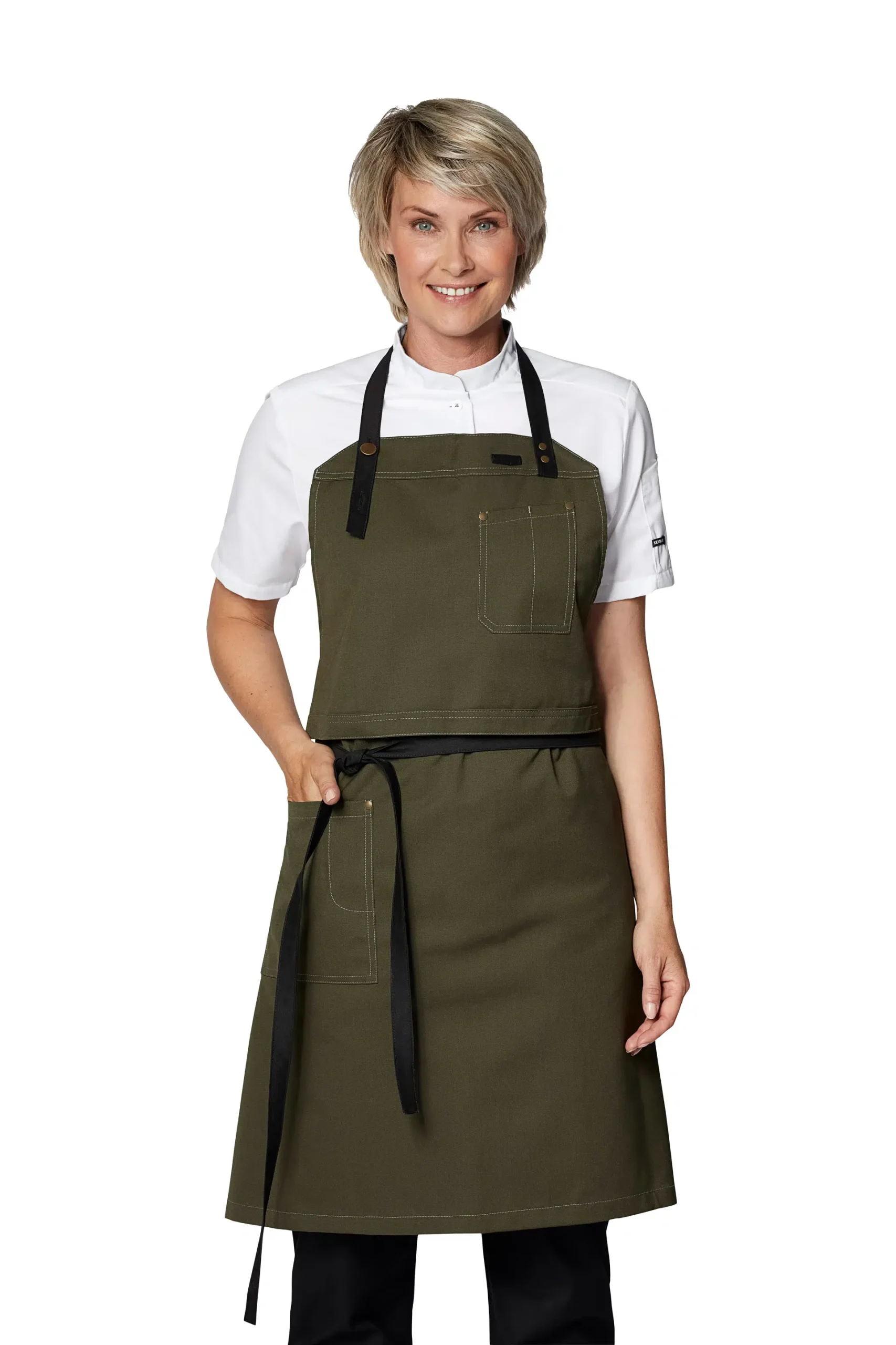 Bib can be folded back so the apron can be used as a waiter’s apron