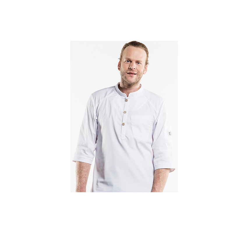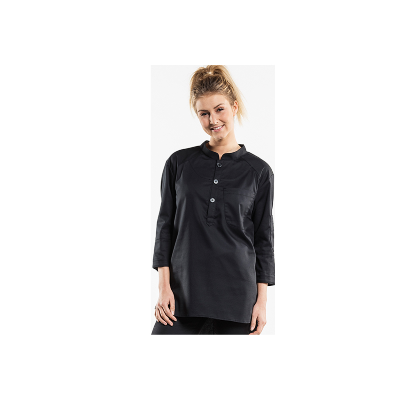 Figure- hugging fit, pullover closure, chest and pen pocket on sleeve, lightweight fabric. 50%CO 50%PES.